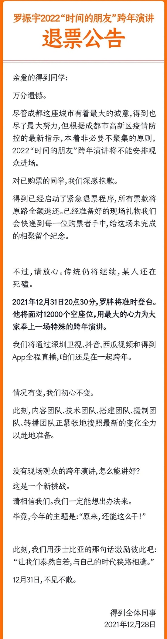 按照原本的计划,罗振宇(罗胖)将在2021年12月31日晚在五粮液成都金融城演艺中心,台下将坐着12000个听众。罗振宇将进行时长超过4个小时的跨年演讲,分享53个故事。但疫情的冲击,使得12000个听众变成了12000个空位。这也是罗振宇“时间的朋友”跨年演讲6年来首次空场举办。