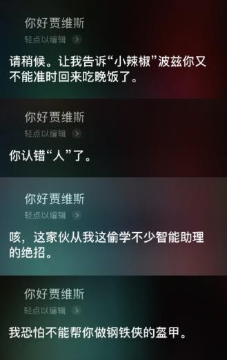 当苹果用户在用siri的时候,说出“你好贾维斯”的时候,siri会代入钢铁侠的剧情来回应你。