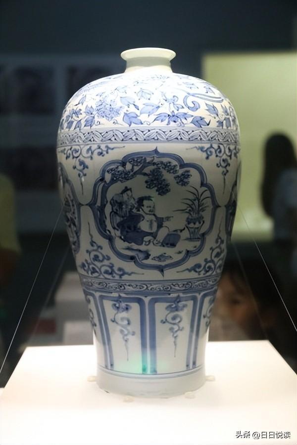 元青花四爱图梅瓶:出土于钟祥的郢靖王墓。高38.7厘米,口径6.4厘米,底径13厘米。梅瓶绘王羲之爱兰图,陶渊明爱菊图,周敦颐爱莲图,林和靖爱梅、鹤图。