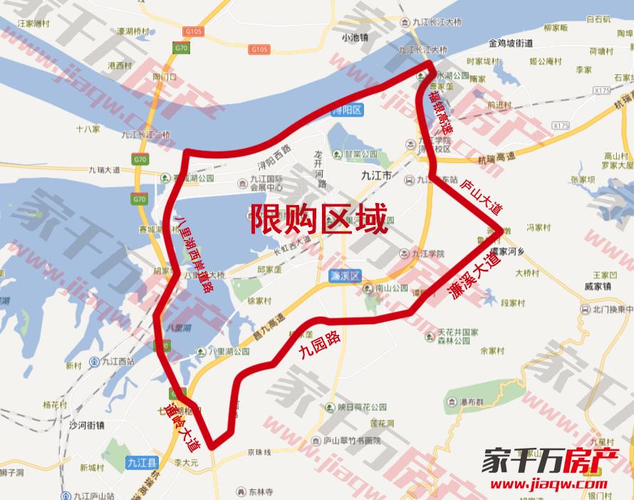 限购区域:从长江大桥起,沿福银高速至庐山大道立交桥交汇处,沿庐山大道向东南(含加州风情项目),至庐山大道与濂溪大道交汇处,沿濂溪大道向西,至濂溪大道与十里大道交汇处,沿九园路向西(含半山溪谷项目),至九园路与通岭大道交汇处,沿八里湖西岸道路至八里湖北大道大桥处,沿八里湖新开河至长江,以上路段、河流与长江形成的闭合范围。