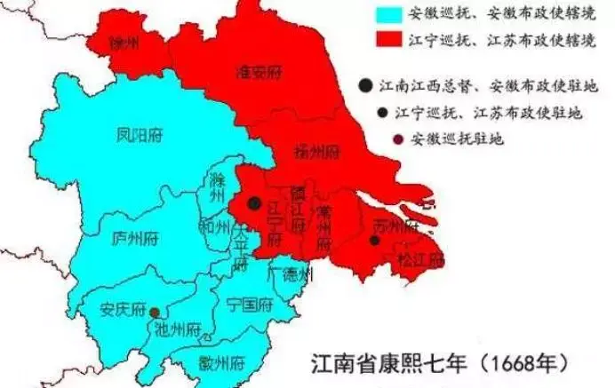 这个江南左和江南右,就是今天的安徽省和江苏省。江苏取江宁府、苏州府二府的首字而来,而安徽取安庆府、徽州府二府的首字而来。