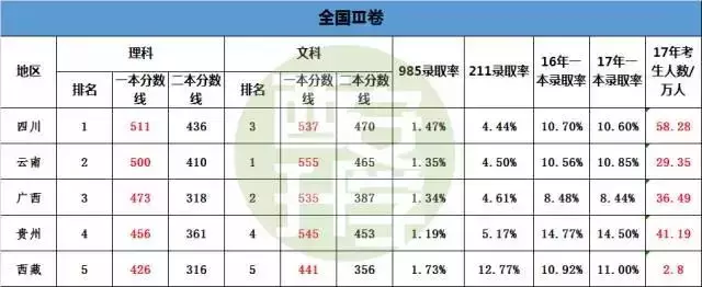 5.对于全国3卷,四川分数线为5省中最高。除了西藏含有较多少数民族考生,这几个省份的一本线相差不是特别大,理科最高的是四川,比最低贵州高出55分,文科最高为云南省比广西高20分。