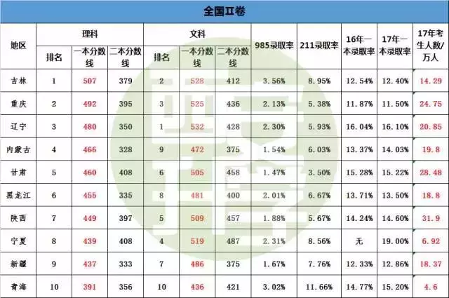 4.对于全国2卷,吉林分数线为10省中最高,同卷同科分数线,最高与最低相差悬殊。一本线上,理科最高的是吉林,比青海分数线高出了116分;文科最高的是辽宁,比青海考生线高出了96分。