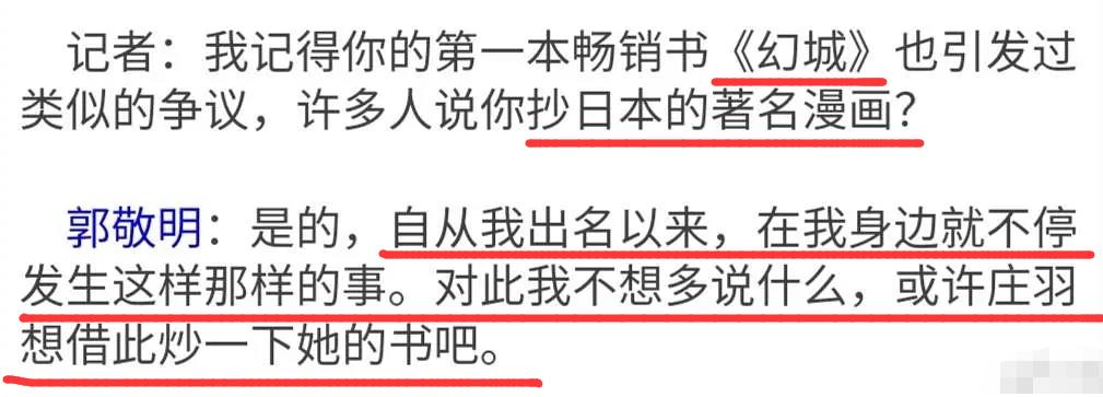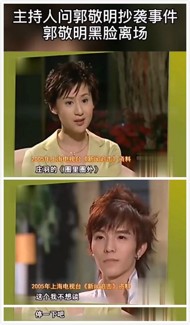 抄袭风波之后,郭敬明在采访中回应过好几次,也曾在采访中因为主持人提到此事,拒绝回答而中断了采访。