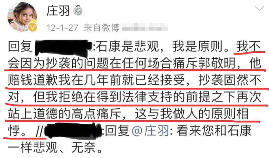 庄羽在抄袭风波之后,也多次就此事进行回应,她在12年就发过这样一条微博,称她不会因为这件事在任何场合痛斥郭敬明,因为他的道歉她很早就接受了,所以她拒绝在得到法律支持的前提下再站到道德的制高点上痛斥他,这有悖于她为人的原则。