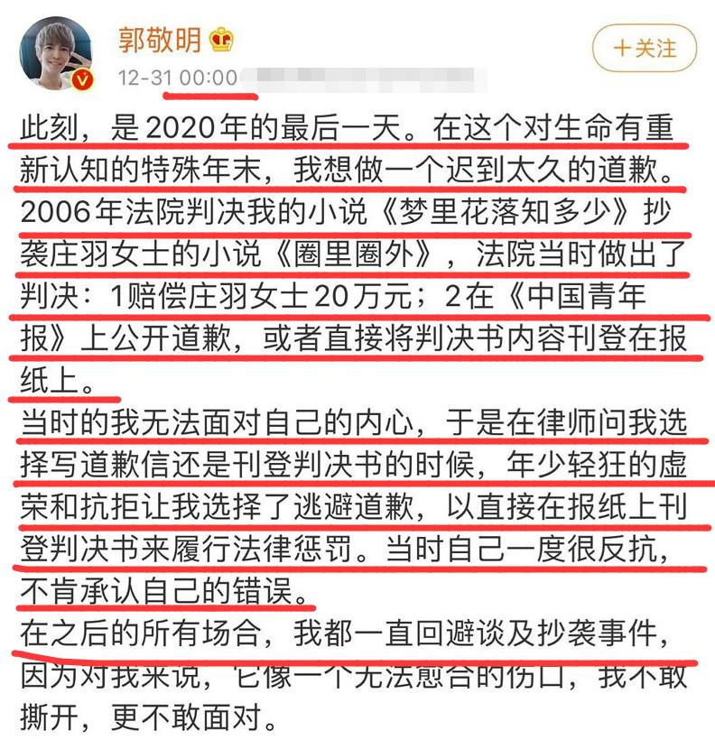 郭敬明表示,在2020年最后一天,他想做一个迟到太久的道歉,在法院判定《梦里花落知多少》抄袭成立后,他没办法直面自己的内心,选择逃避向庄羽道歉,只是把法院的判决书刊登在报纸上,当时他一度很抗拒,不肯承认自己的错误,之后在所有场合,他都回避谈及这件事,因为他不敢面对。