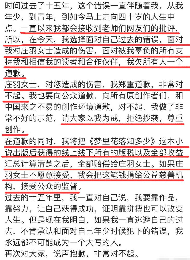 因为抄袭的事情,他这十几年来一直都被其他编剧作者和网友谩骂,所以在今天他选择直面过去的错误,向庄羽郑重的道歉,让大家以他为戒,拒绝抄袭,同时他也表示会把《梦里花落知多少》这部小说的所有收入汇总过后全部赔给庄羽,如果她不接受的话,他就把这些钱捐出去。