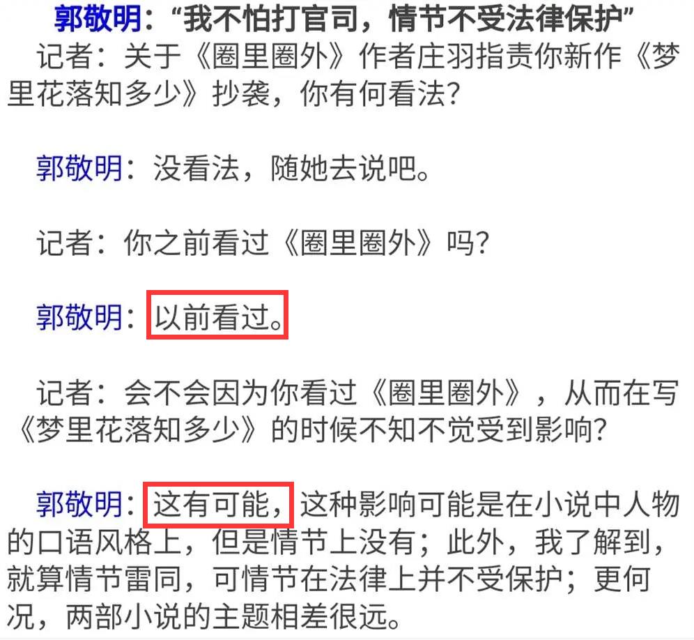 郭敬明也表示他有看过庄羽的《圈里圈外》这本书,但他小说的主题跟她的作品相去甚远,而且他觉得他小说里写的语句都是一般文学作品的常见描述,甚至嘲讽庄羽是想借此炒作一下她那本书,结果现在他一道歉,这些旧帖都被网友扒了出来,有点打脸。