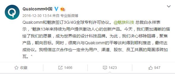 2016年12月30日,高通官方发布了与魅族和解的公告,其称Qualcomm与魅族签订3G/4G全球专利许可协议。这个事件代表着多年关系紧张的高通和魅族,终于得到了和解。而这个结果对于双方都是有利的,高通能够在不断壮大的魅族那分一杯羹,魅族得到高通的支持之后也不用一定用着MTK处理器,在三星那边也多了一个筹码。