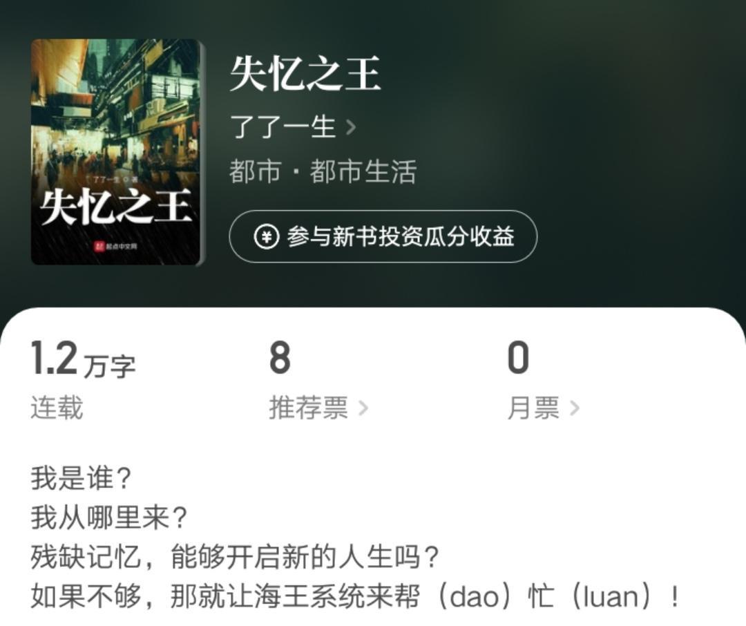 大神作者“了了一生”又开新书了,这一次还是在起点。新书名《失忆之王》,目前一万多字。