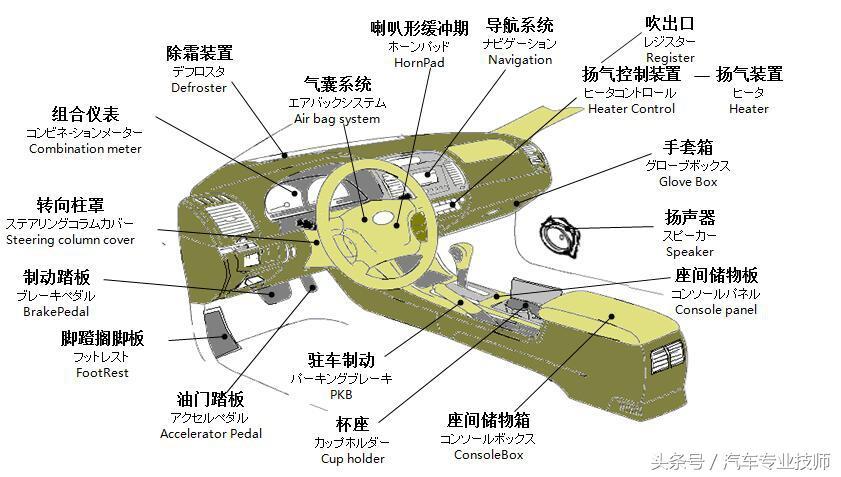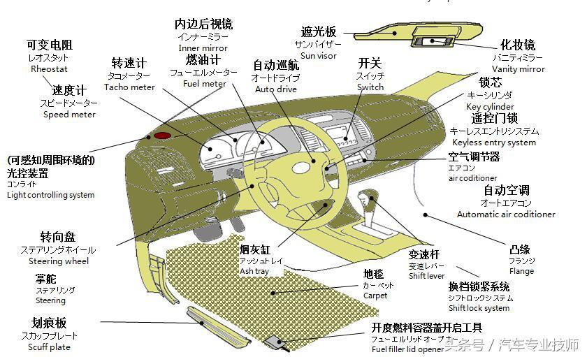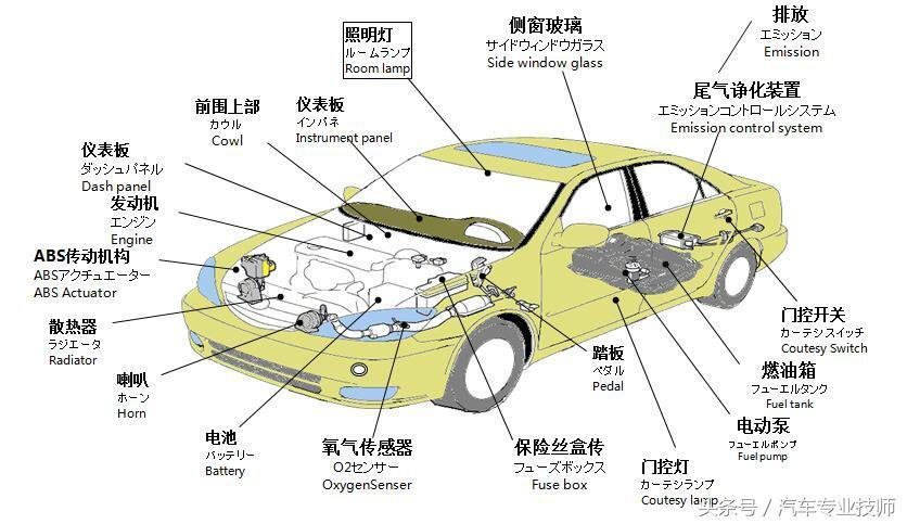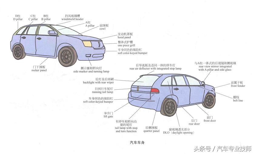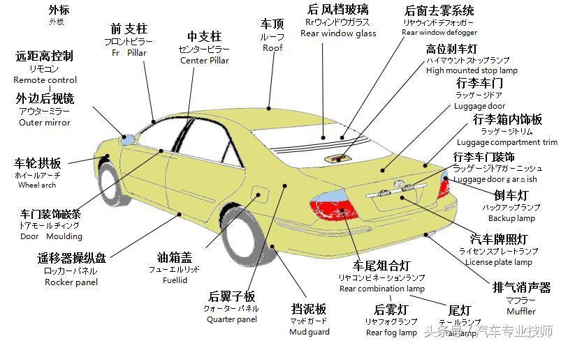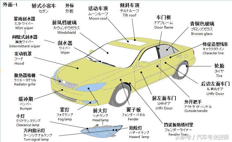在学习介绍汽车各部分原理之前,我们可以先了解一下关于汽车车身和内饰的各部分名称。