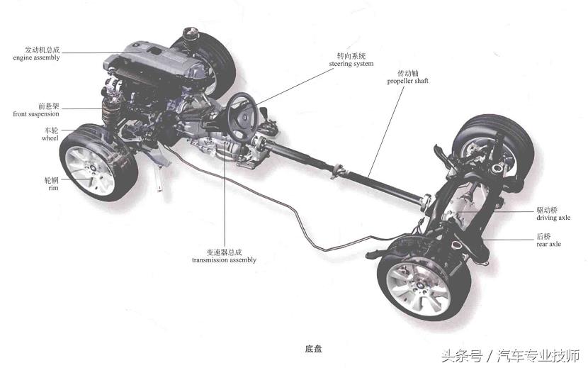 2、底盘:作用是支撑车身,接受发动机产生的动力,并保证汽车能正常行驶。