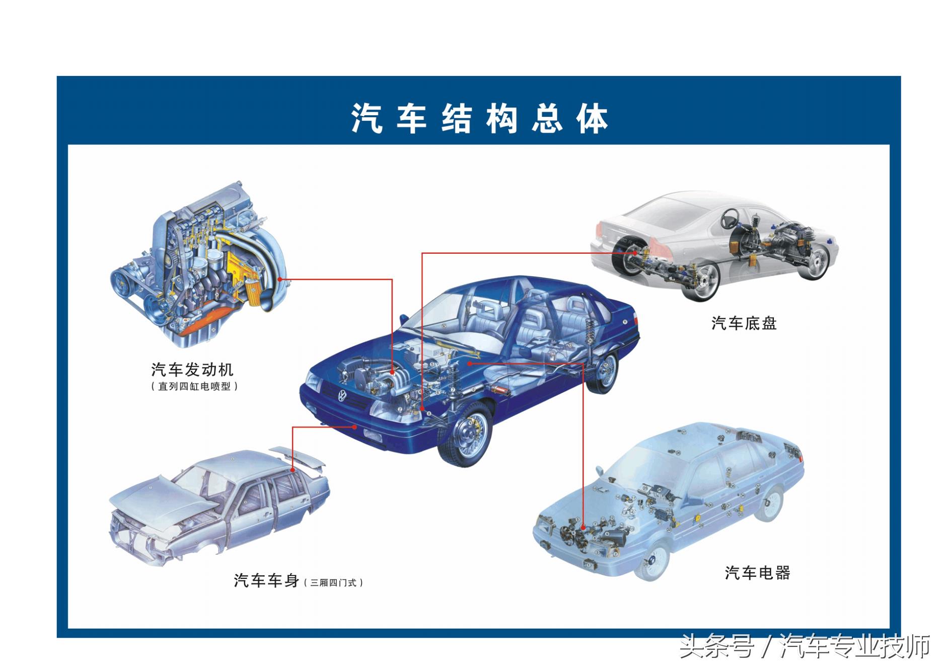 一辆汽车有很多复杂的零件组成,不同汽车的外部造型和内部结构可能会有所不同,但是从整体结构来看,汽车一般由发动机、底盘、车身、电气设备等四个基本部分组成。