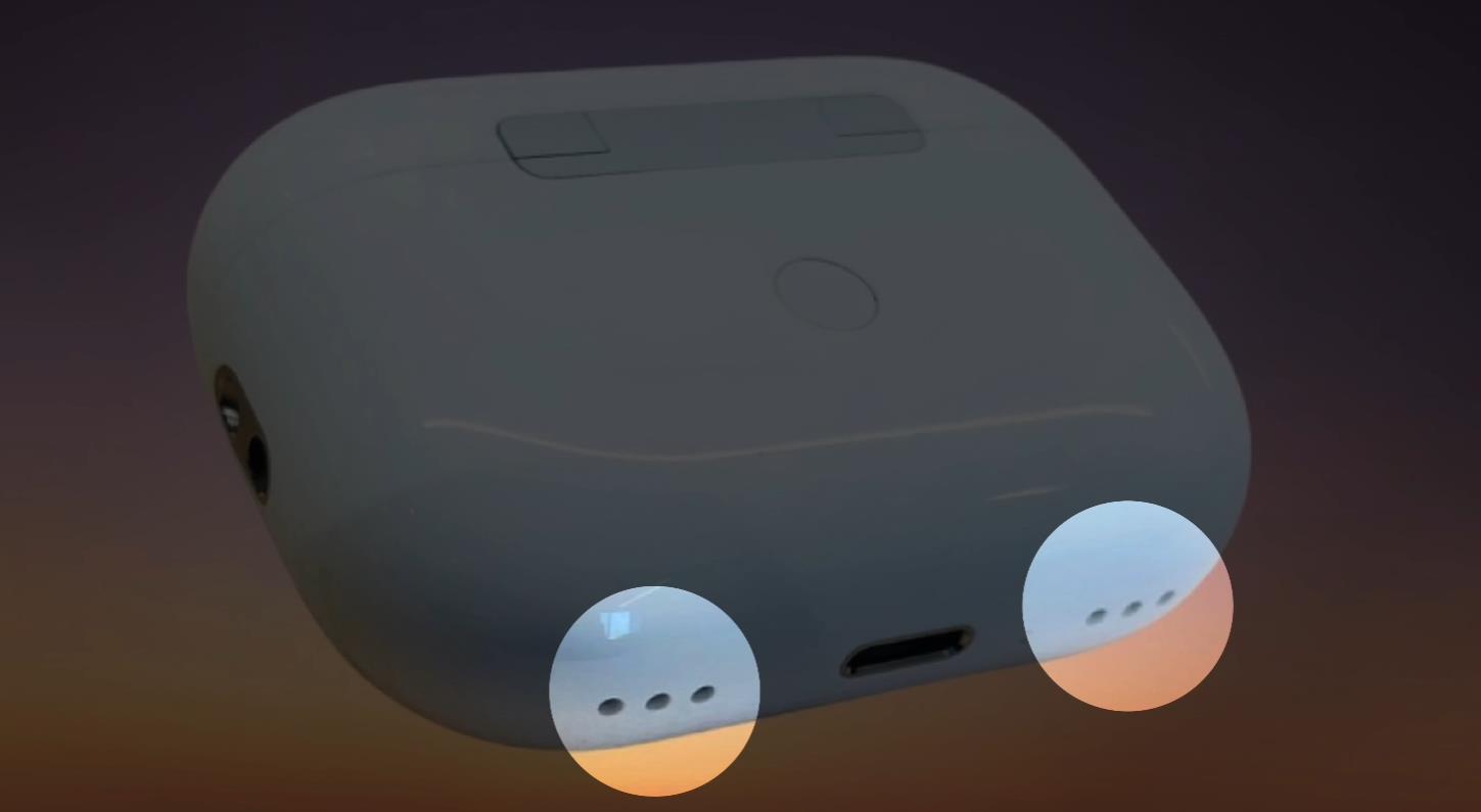 底部还预留了扬声器发声的孔位,在找不到耳机的时候,可以通过手机中的找寻功能让其播放声音,以便用户可以快速找到它。