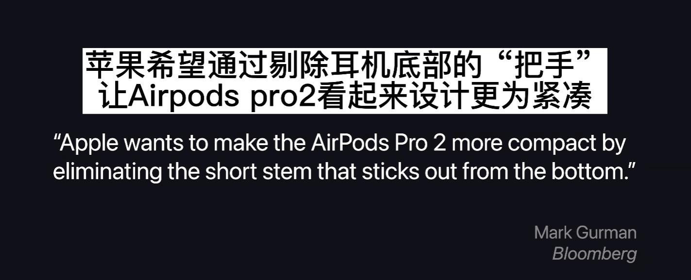 设计上,自2016年以来所有的AirPods都配备了“耳机把手”但是新款的airpods pro2可能会有所改变,彭博社的Mark Gurman表示: 苹果希望通过剔除耳机底部的“把手”,让Airpods pro2看起来设计更为紧凑。
