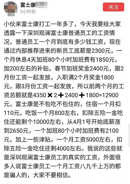 富士康员工真能月入八九千?内部员工:每月加班80小时才五千块