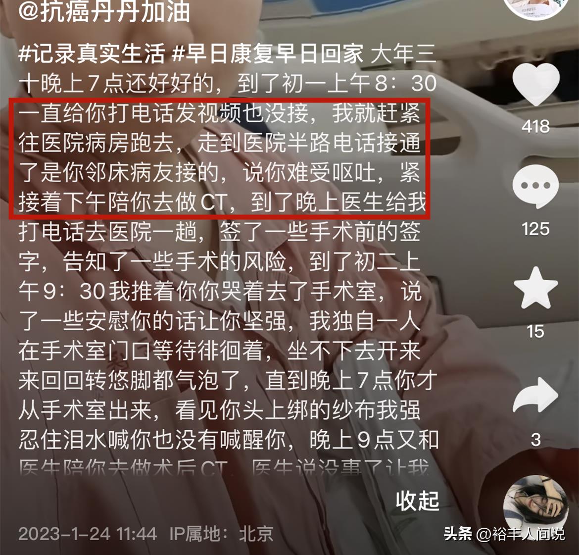 翻看其视频账号不难发现,丹丹最后一次更新还要追溯到1月24号,当时正值大年初三,因为需要抗癌,所以她不得不留在医院过年。原本她的身体还算不错,大年初一因为呕吐所以不得不再次接受检查,随后便被紧急安排手术。