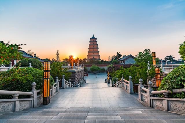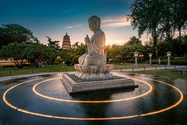 这期来讲一下西安大雁塔南广场。这里宽敞明亮,是极好的观光之地。它于2001年初建成后开放,占地32.6亩,蕴藏着翠绿成荫的树木和竞相开放的花朵。五彩斑斓与一片碧绿交相辉映,颜色明亮得让人不舍移视。叮咚池水清澈如眸,将周围的一切倒映其中,仿佛连成一片。孩子们在这里追逐打闹,大人们则在大树下乘凉休息。这里适合放松,适合歇息,也适合远眺大慈恩寺内的古老建筑,以及近看门口这尊玄奘立式雕像。