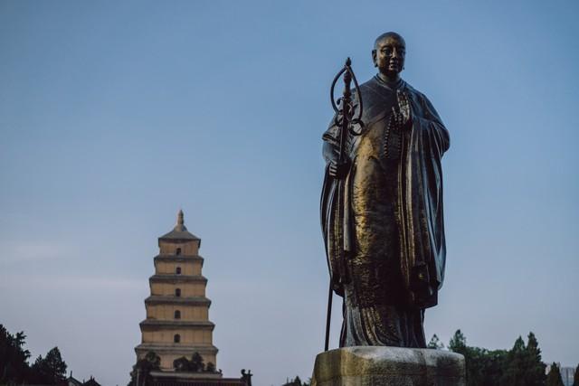这尊庄严肃穆的立式雕像,便是玄奘了。只见他面目慈善,看上去宽厚、淳朴。就是如此慈祥之人,成为了我国的伟人之一。玄奘作为印度正统佛教学说的集大成者以及中国传统佛教成就最大的学者之一,历年来,在中印文化交流史上作出了重要的贡献。在天竺学习之后,他便编写了一本《大唐西域记》,将这其中的所见所闻全部记录在内,包括疆域、气候、文化、风土、人情、语言等的历史传说,这为佛教及其它国家概况的研究者留下了珍贵的历史材料,也使得其它国家对东亚文化有了更为详细的了解。除此之外,在中印文化交流史上,他的译经无疑是最辉煌的一笔。这不仅促进了文化的深入了解与交换,还加深了两国人民的友好来往,可以说,玄奘是两国交流之间的催化剂。从独自一人行走天竺研究佛教,到回国之后专心钻研译经,他身上的许多宝贵品质值得我们每个人学习,对于学习的热忱、对于艰辛路程的毫不畏惧、对于真理的不断苛求、对于翻译的坚持不懈,以及最重要的,对于祖国的热爱。他被鲁迅誉为“中华民族的脊梁”并不是毫无道理。今时今日,大慈恩寺将玄奘铜像立在此处,为的不仅仅是蔡奠这位伟大的人士,更是提醒我们每一个人,都要像玄奘一般,将学习放在心里,对祖国不离不弃。