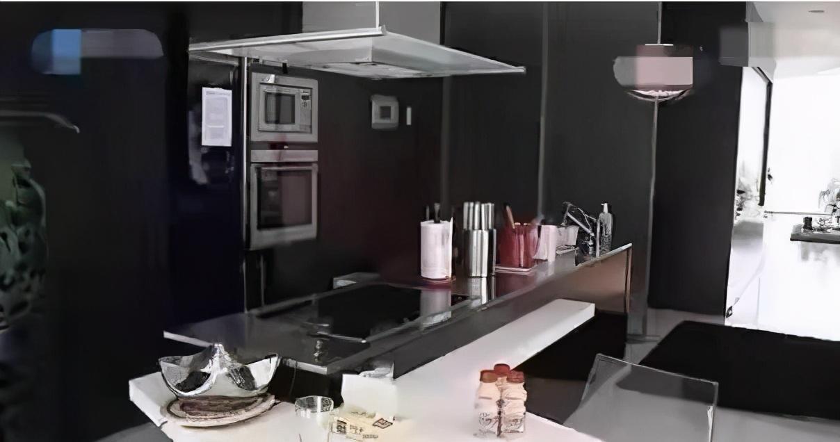 就连厨房的墙面都设计成了精致的黑颜色,其实这种设计虽然美观但是有一点油渍我们都需要进行清洁,打理起来也会非常麻烦,厨房与餐厅相邻,中间有一个大大的岛台,平时可以在岛台上摆放一些物品,这样拿取起来也会方便很多。