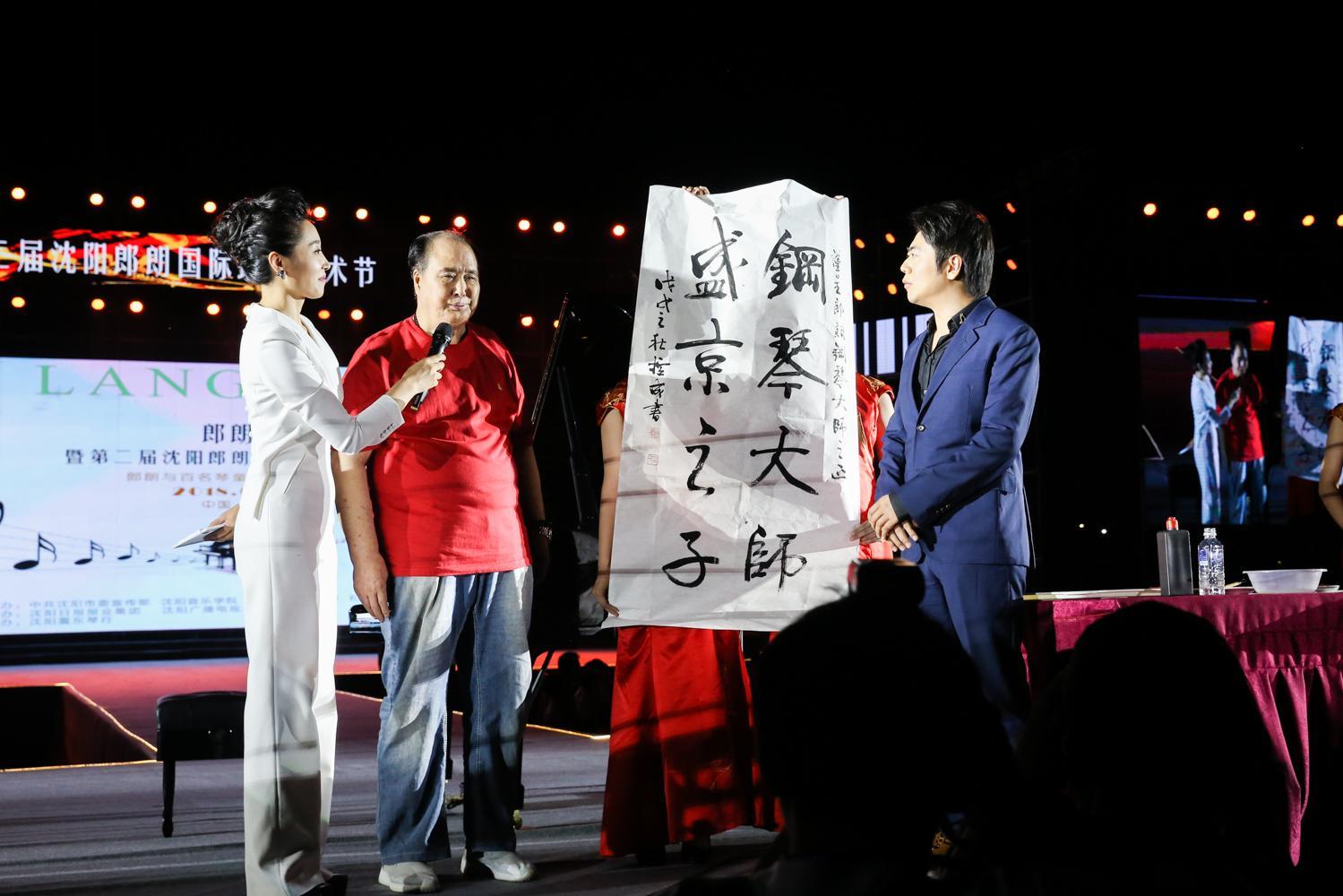 哲成现场题写“钢琴大师盛京之子”送给郎朗