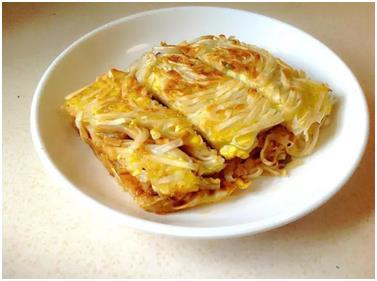 5、碗中打入一个鸡蛋打散,均匀倒入面条里,小火慢煎至底面焦脆