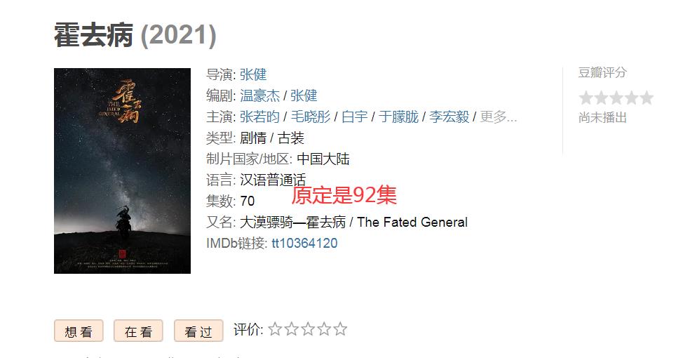 如今距离霍去病杀青已经过去了五年,这部剧也积压了五年,看起来播出是遥遥无期。小编觉得这部剧在审核层面很可能卡在了集数上面,另外也和剧中的爱情元素有关。目前,这部剧已经从最初曝光的92集减少到了70集,而且还有可能删减更多的戏份,导致匆匆忙忙播出。