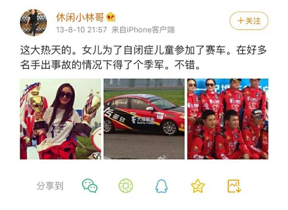 而不久前,杨幂的一组旧照曝光让大家更是惊讶不已,这是13年杨幂爸爸在自己的社交平台上晒出的一组照片,照片上的杨幂一身专业的赛车服很是英姿飒爽,手拿奖杯更是成为全场的焦点,而杨爸在配文中表示这是女儿为了自闭症孩子们参加的赛车比赛,不得不说这样的杨幂真的是很让人敬佩了。